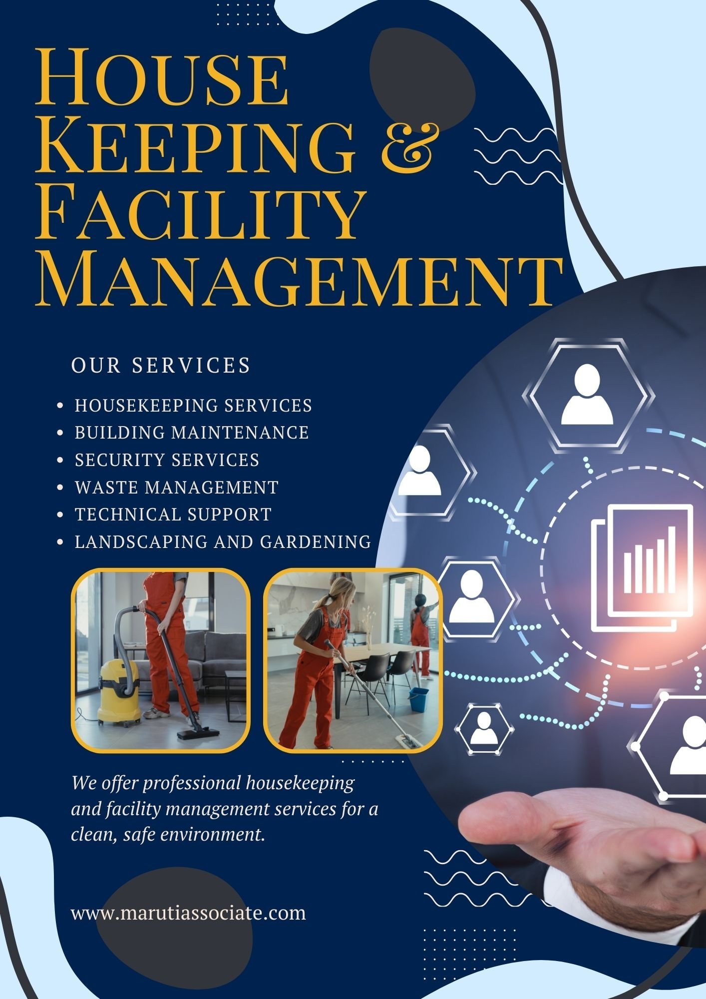 Maruti Associates is a leading provider of professional Housekeeping and Facility Management Services, offering tailored solutions to ensure clean, well-maintained, and efficient workspaces. Our services include daily cleaning, floor care, waste management, restroom sanitation, and building maintenance, along with comprehensive facility management solutions such as security and energy management. We prioritize creating hygienic and productive environments for businesses of all sizes, ensuring cost-effective and reliable service that supports smooth operations and business growth. Let Maruti Associates handle your housekeeping and facility needs with excellence.
